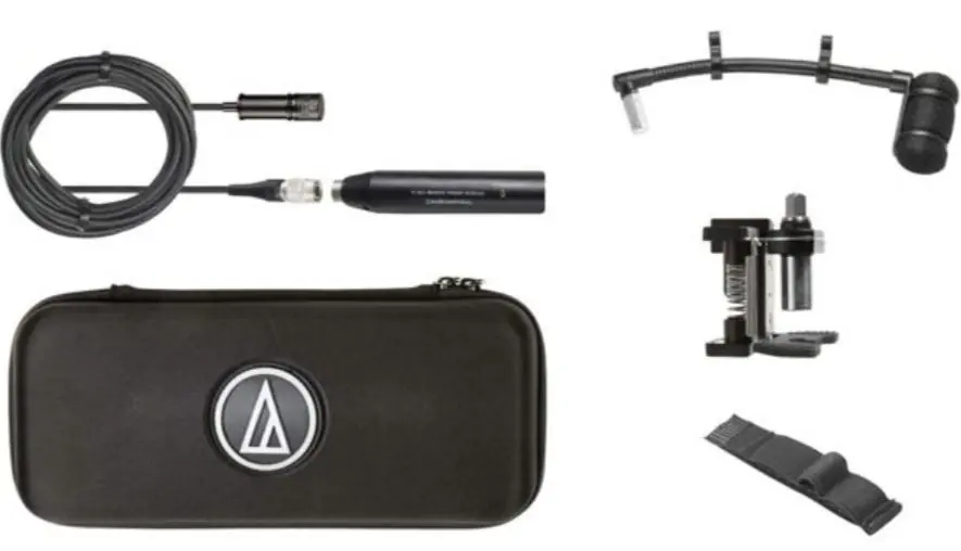 - ATM350W Micrófono cardioide de condensador con sistema de montaje para instrumentos de lengüeta: micrófono ATM350a, flexo AT8490, soporte para instrumentos de lengüeta AT8491W, módulo de alimentación AT8543, caja de transporte, soporte velcro AT8468.