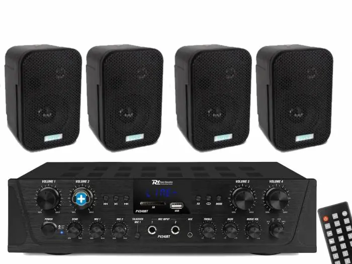 Equipo de sonido compuesto de amplificador de 4 zonas y 4 altavoces de 4 ohm. Pefercto para sonorizar en instalaciones tanto en interior como en pequeños exteriores o terrazas. Este equipo de Hilo musical dispone de con 4 zonas de control de volumen diferenciadas, te permite tener un control de volumen de cada altavoz. , un sonido con la misma musica o mensajes de voz, pero te permite tener 4 volumentes diferenciados, de una manera facil y sencilla desde el frontal del amplificador. Maximo control y con un montaje muy sencillo.
