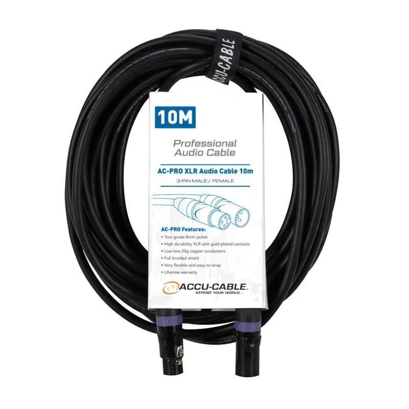 El cable de audio ACCU-CABLE AC-PRO XLR AUDIO CABLE 10M es un cable de alta calidad de la serie AC-PRO, perfecto para conexiones de audio profesionales. Con una longitud de 10 metros y conectores XLR macho a hembra, este cable asegura una conexión sólida y un rendimiento de audio superior en cualquier entorno de trabajo.