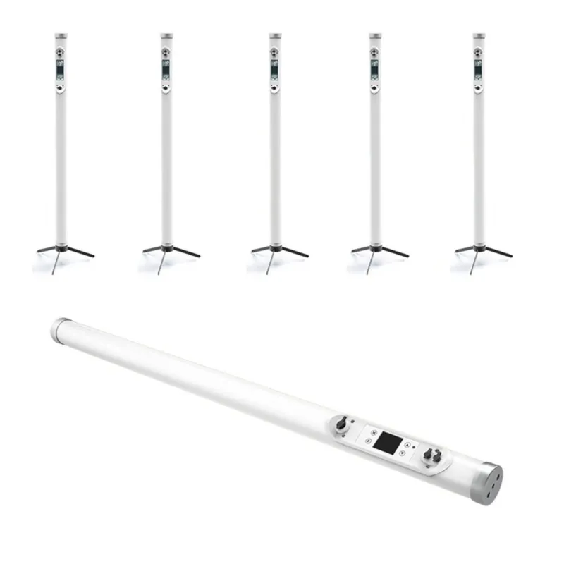 - Cada tubo viene con un control remoto, trípode, adaptador de corriente, cable de carga, 2 cables DMX y 2 Herrajes para colgar el tubo.