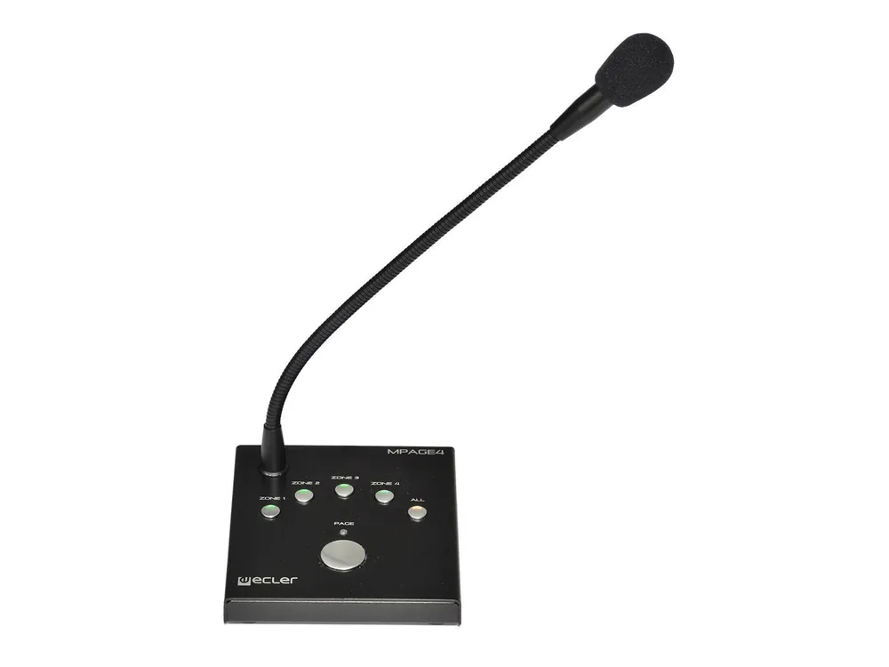 MPAGE4 es una consola de avisos de sobremesa de 4 zonas, compatible con DAM614, serie CA, etc. Permite enviar avisos de voz a tiempo real con selección de zonas de destino.