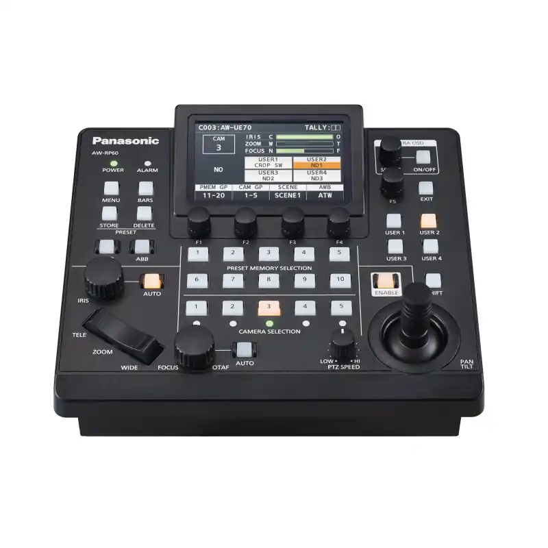 Presentamos el nuevo controlador de cámaras remotas AW-RP60. Este controlador presenta una pantalla LCD de gran tamaño que permite ver los menús de la interfaz gráfica de usuario con una gran nitidez, así como un joystick mejorado que permite un control más preciso; además, es compatible con todos los modelos actuales de cámara PTZ de Panasonic. Gracias a las mejoras en la interfaz gráfica de usuario, ahora puede verse en todo momento directamente en la pantalla toda la información importante relativa a las cámaras, como por ejemplo el diafragma, el zoom y el enfoque. El AW-RP60 también permite utilizar hasta 200 cámaras en 20 grupos y gestionar 100 preajustes; además, su compatibilidad con PoE permite una sencilla integración.