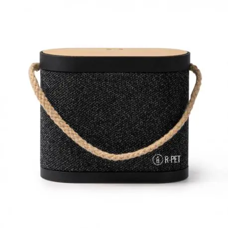 Altavoz inalámbrico con cuerpo de bambú, poliéster reciclado RPET y asa de transporte en algodón, con 5W de potencia y conexión Bluetooth. Distancia máxima de funcionamiento de hasta 10 metros y tiempo de funcionamiento continuo de hasta 5 horas. Recargable con cable Tipo C, incluido. Con función de carga inalámbrica en la superficie de bambú, con 15W de potencia para recarga de dispositivos provistos de esta tecnología. Con indicador luminoso de carga. Presentación en caja diseño eco.