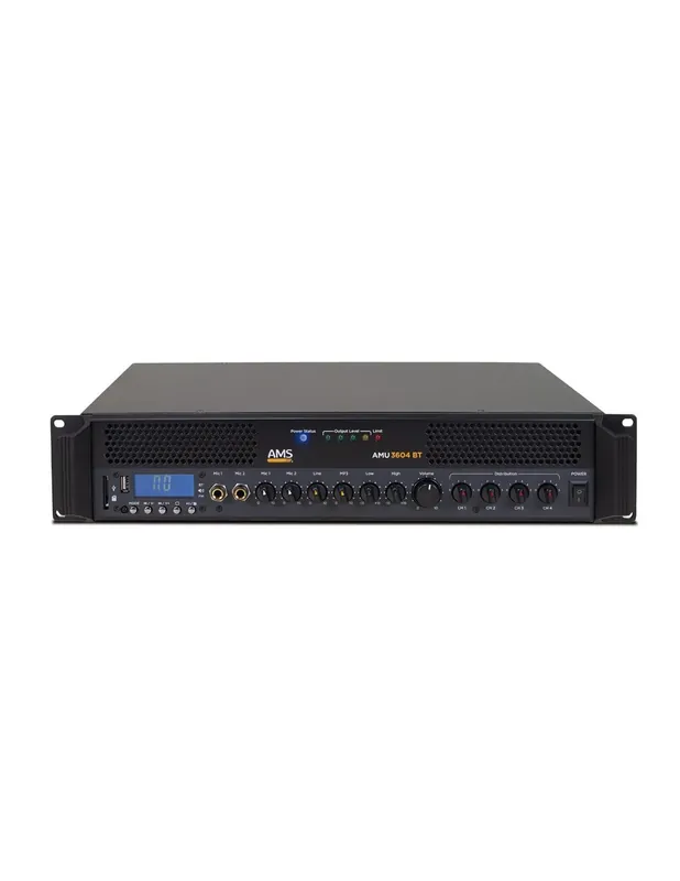AMU 3604 BT es un mezclador/amplificador que puede operar tanto en baja impedancia (8-16 Ohm) como L100V. Incluye 3 canales de entrada (1AUX + 2 MIC), siendo una de las entradas MIC (MIC 1) con prioridad. Incorpora una interfaz USB para archivos de audio externos, así como conectividad Bluetooth, siendo posible enviar archivos de audio desde un smartphone o dispositivo similar. La pantalla muestra toda la información de pista, modo de funcionamiento, nivel de volumen, número de pista o tiempo transcurrido.