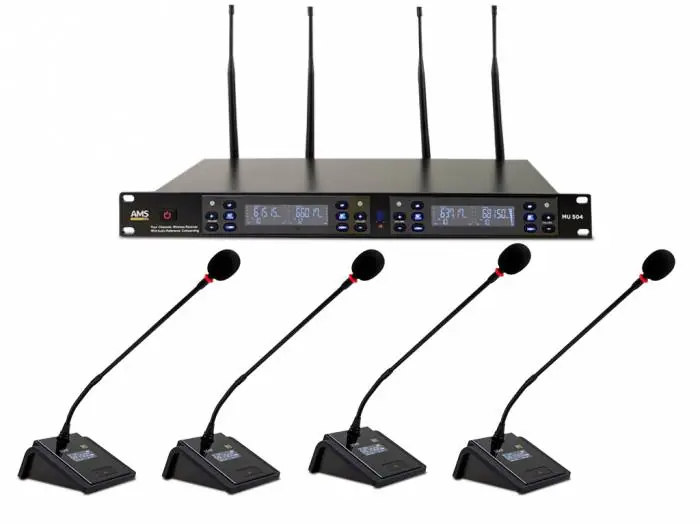 MU 504 es un sistema de conferencia que incorpora 4 micrófonos de sobremesa. Su rango va desde los 612 MHz a los 680 MHz, con 180 canales en total. La sincronización entre los micrófonos y receptor se realiza por IR, marcando la frecuencia deseada en el receptor, pulsando el botón de escaneo y acercando el micrófono a sincronizar. Las pantallas de gran formato muestran toda la información necesaria: frecuencia, canal, ID, nivel de batería, nivel AF y RF. Las salidas individuales están balanceadas junto a una salida de mezcla de todas ellas desbalanceada. El receptor se alimenta con el transformador externo y los micrófonos con 3 pilas tipo AA.