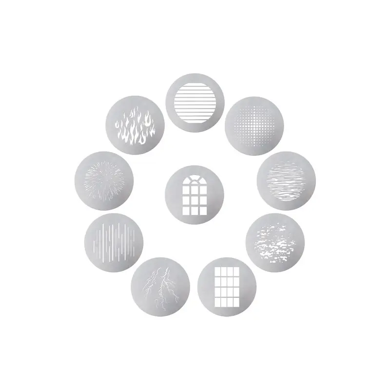 Diseñado para usar con el accesorio de proyección de Light Storm LC 120d II, 120D y 300D, el kit de gobos Spotlight de 10 piezas de Aputure permite que las luces equipadas con Spot Light proyecten patrones o imágenes de tamaño B (3.4 «) de la Juego de 10 gobos o cualquier otro gobos de tamaño B. El kit incluye gobos Fireworks, Linear, Dot, Church Window, Modern Window, Fire, Scatter, Lightning, Ripple y Grille.