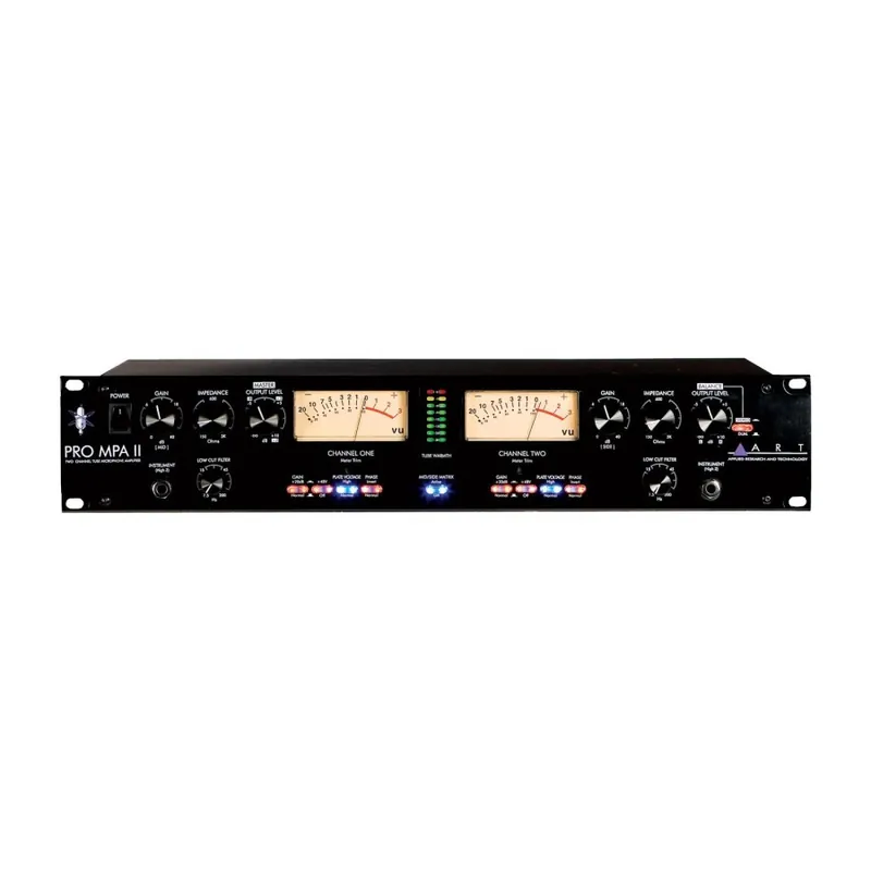 El ART Pro MPA II es un preamplificador de micrófono de alto rendimiento que puede configurarse para un funcionamiento dual mono o estéreo con soporte de micrófono lateral/medio seleccionable, sumando el canal adyacente, para decodificar señales izquierda/derecha. Cada circuito de entrada de micrófono, con alimentación fantasma de 48v seleccionable, presenta una impedancia de entrada variable que puede alterar drásticamente el rendimiento de cualquier micrófono dinámico o de cinta de calidad.