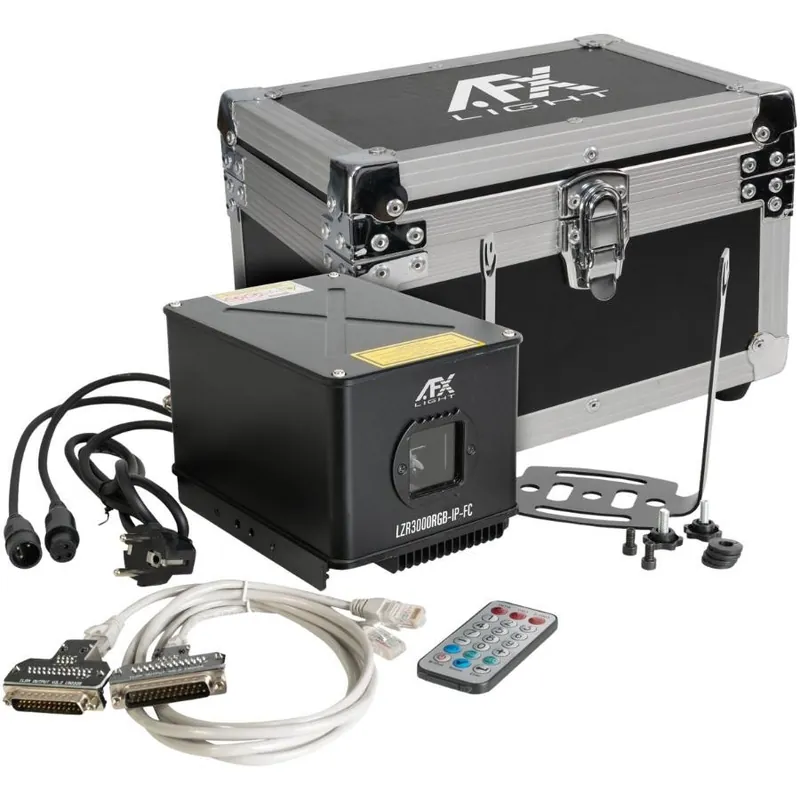 El paquete incluye el láser AFX LZR3000RGB-IP-FC, un soporte de montaje, dos llaves de seguridad, un conector estanco y un flight case para transporte.
