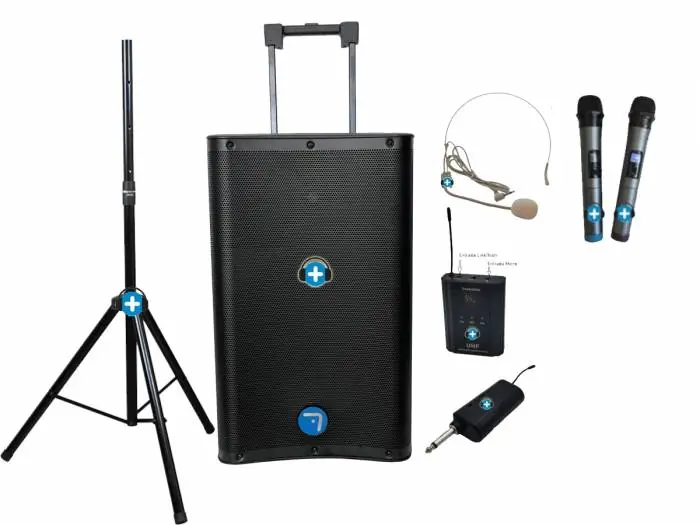 Pack compuesto de altavoz activo de 12 pulgadas con bateria, soporte de altavoz y microfono de diadema extra