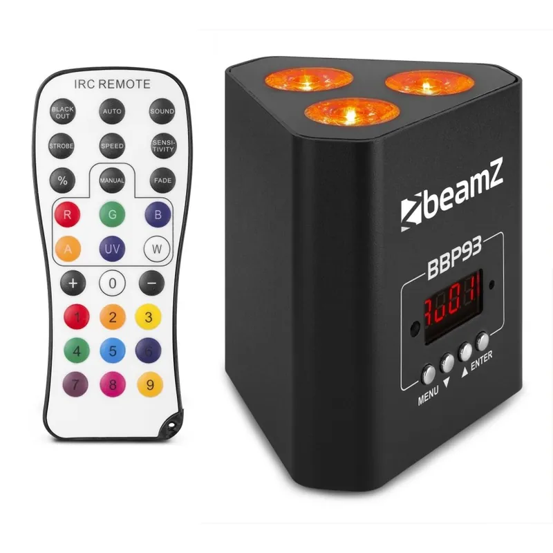 El BBP93 es un foco PAR fabricado por Beamz operado por batería ideal para utilizar como foco para iluminación hacia arriba.