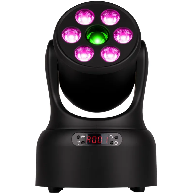 - Fuente de luz híbrida: 6 LEDs 4‑en‑1 RGBW de 8 W cada uno para wash colorido + LED blanco de 30 W para spot/gobo.