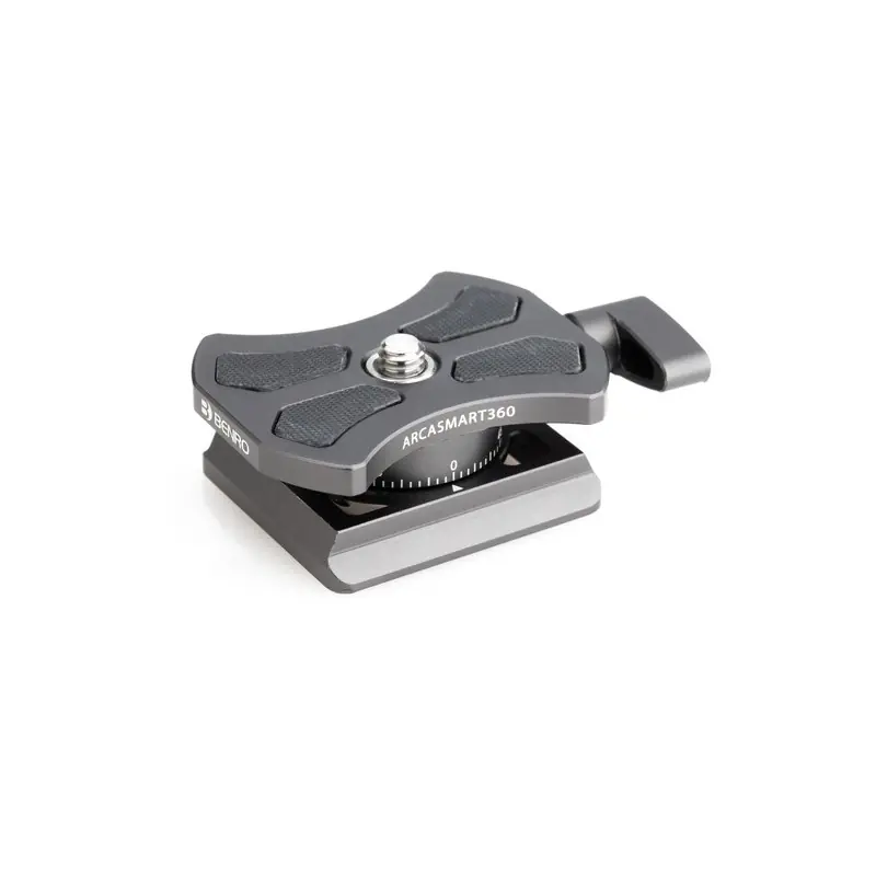 La versátil placa adaptadora giratoria ArcaSmart360 de Benro es una placa adaptadora giratoria que agrega un plano adicional de movimiento panorámico a las cabezas de trípode y monopié de cualquier estilo. El componente de la placa de liberación rápida es compatible con Arca-type y Manfrotto RC2. El soporte giratorio de la cámara cuenta con una palanca de bloqueo y una escala numerada para obtener resultados precisos y repetibles. El tornillo de montaje de la cámara de 1/4″-20 se puede apretar con el anillo en D, una llave hexagonal o una moneda.