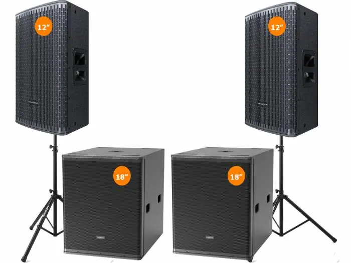 Equipo de sonido compuesto de dos altavoces de 12 pulgadas y una pareja de soportes, con este equipo podrás sonorizar tus fiestas, y eventos tanto en exteriores como en interiores