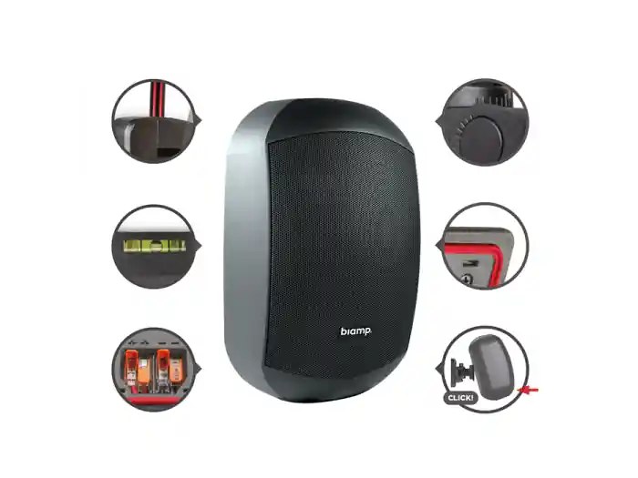 Gracias al revolucionario diseño del soporte ClickMount, MASK6CT es sin duda el altavoz más rápido y fácil de instalar hasta la fecha. Los clics predefinidos en el ClickMount aseguran una alineación perfecta para cada altavoz. Con el sistema discreto de gestión de cables, el nivel de burbuja integrado y los conectores de entrada/salida, el cableado completo se realiza en el soporte. Para completar la instalación, simplemente haga clic en el altavoz del ClickMount!