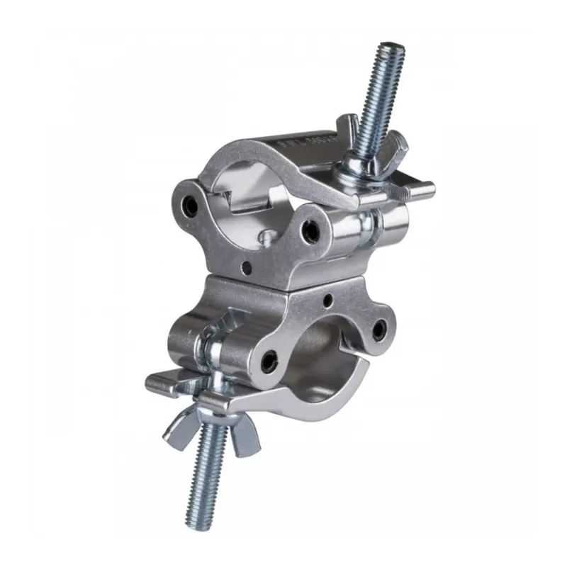 La BRITEQ SWIVEL CLAMP 502-V2 ABRAZADERA DOBLE GIRATORIO 38-51MM es una abrazadera de montaje doble con acoplador giratorio que se puede girar 360°, ideal para la conexión de dos trusses. Diseñada para soportar una carga de trabajo segura (SWL) de 500 kg, esta abrazadera es perfecta para tubos de 38 a 51 mm. Certificada por TÜV, asegura una instalación estable y segura en diversas configuraciones.