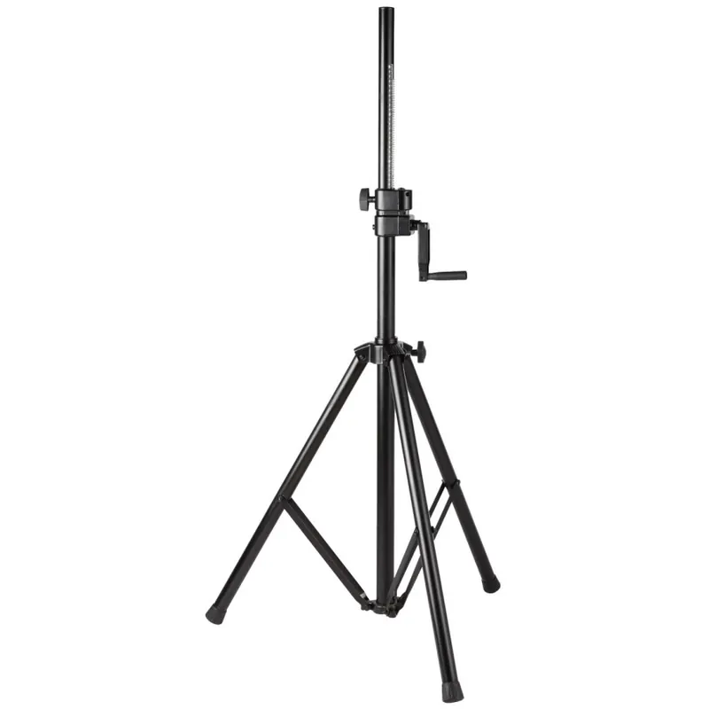 Trípode reforzado en acero negro equipado con cremallera con sistema de seguridad que impide el deslizamiento del tubo.