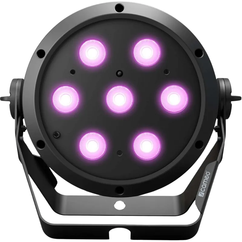Este foco PAR con 7 LED de cuatro colores y 4 W tiene una potencia luminosa de 1350 lm, ideal para músicos, DJ y empresas de alquiler de equipos. El ROOT® PAR 4 de Cameo no solo permite crear excelentes mezclas de colores RGBW, sino que también ofrece una gran flexibilidad para generar varios tonos de blanco. Para ello, los colores y los ajustes se configuran muy fácilmente a través de los cuatro botones y la pantalla OLED, sin necesidad de mando a distancia. El equipo se controla por DMX, como maestro/esclavo o en modo autónomo, y se sincroniza con el sonido a través del micrófono integrado. Opcionalmente se puede adquirir un mando a distancia por infrarrojos como accesorio (n.º art. CLPFLAT1REMOTE).