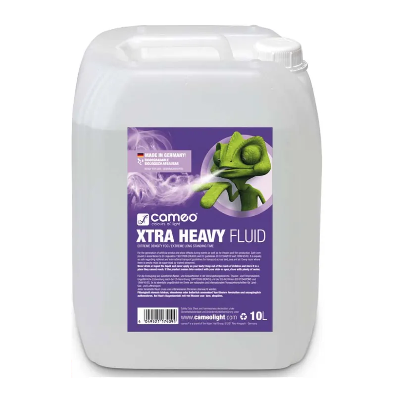 El líquido Xtra-Heavy Fluid de Cameo genera una niebla extremadamente densa y estable, de duración especialmente larga y presenta un comportamiento de reflexión excepcional. Su fórmula está específicamente diseñada para utilizar al aire libre en todas las máquinas de niebla convencionales.