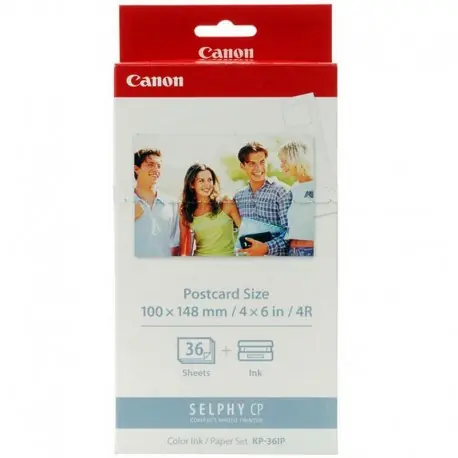 Este kit de papel de Canon incluye 36 impresiones de tamaño 10 x15, es decir el tamaño de  tarjeta postal estándar. El más utilizado en la historia de la fotografía, y compatible con infinidad de álbumes y marcos de fotos