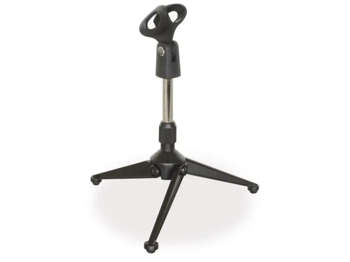 Soporte de micro con tres patas plegables para sobremesa o instrumentos muy cercanos al suelo. Pinza de plastico con adaptador de 3/8″ y 5/8″. Util para la mayoria de microfonos del mercado.