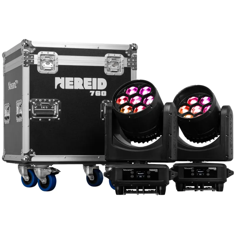 El BeamZ Pro Nereid760 es una cabeza móvil LED de alto rendimiento diseñada para cubrir las necesidades de iluminación más exigentes. Este pack incluye 2 unidades junto con un flightcase resistente con ruedas, facilitando el transporte y protección del equipo en montajes profesionales.