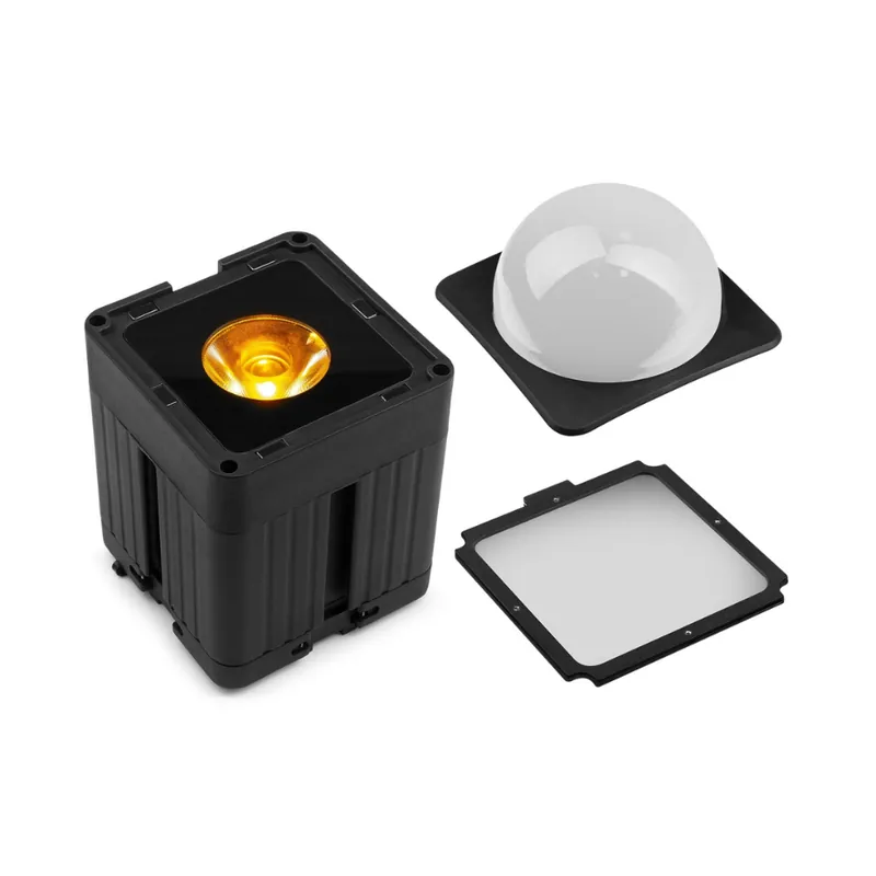 Experimenta la versatilidad del BEAMZ 150.640 KUBE20BK LUCES LINKEABLES A BATERÍA PARA EXTERIOR, una luz de batería enlazable con un potente LED RGBWA-UV de 20W, perfecta como foco de posición o iluminación de pared. Diseñado para uso en interiores y exteriores, este dispositivo cuenta con una batería integrada que ofrece hasta 12 horas de duración, dependiendo de la configuración de color e intensidad. La comunicación es sencilla mediante control remoto IR, WIFI (a través de la función de la aplicación) y DMX inalámbrico, facilitando la conexión entre varias unidades. Se suministra con un versátil soporte, un paquete de filtro magnético y acoplamientos para una conexión fácil entre unidades KUBE.