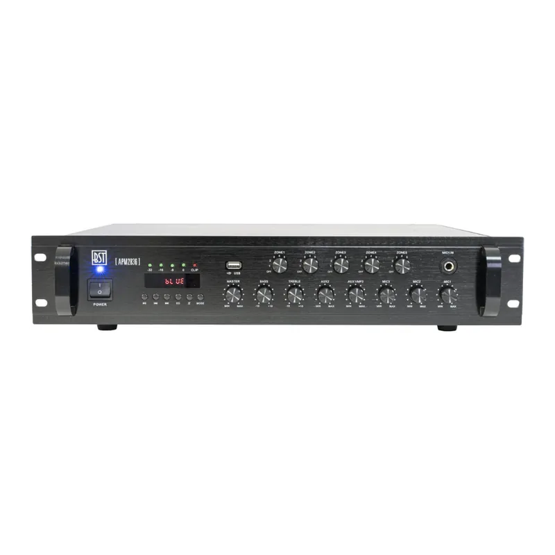 El BST APM2836 es la solución perfecta para tus necesidades de megafonía. Este amplificador-mezclador de 5 zonas con una potencia de 350W te ofrece una conectividad versátil con USB, Bluetooth y sintonizador FM, lo que te permite reproducir música desde diferentes fuentes.