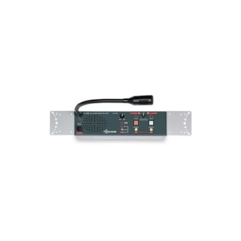 La unidad de sobremesa ALTAIR ES-200, presentada en formato pupitre, incorpora de serie dos orejeras para permitir su instalación en Rack de 2U de altura. Este sistema permite elegir varias inclinaciones así como ser empotrada en paneles ó cajeados. Esta unidad se alimenta remotamente por los cables de Intercom.