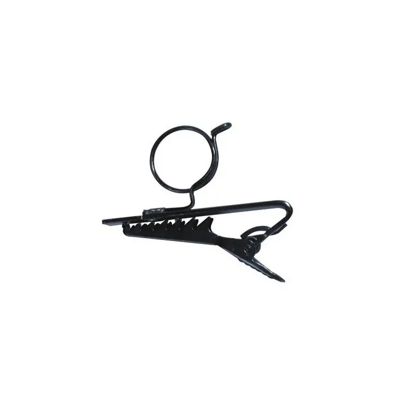 Clip metálico para micrófonos miniatura de solapa, lavalier o corbata. Anillo de 12 mm Ø para micrófonos, con resorte ajustable.