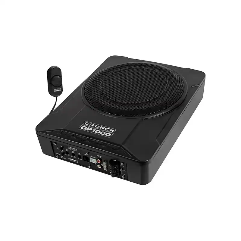 La caja acústica autoamplificada Crunch GP 1000 es muy compacta, gracias a su tamaño puede ser instalada en una gran variedad de partes del vehículo, El amplificador integrado cuenta con ajustes para crossover, phase y bass boost y se puede manejar con el mando a distancia. El subwoofer instalado en esta caja es 10″.