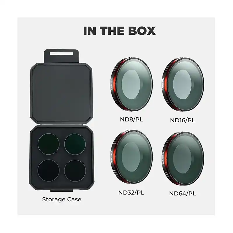 Gestión de luz diurna brillante: incluye filtros ND8/PL, ND16/PL, ND32/PL y ND64/PL para controlar eficazmente la exposición a la luz mientras reduce los reflejos en entornos exteriores brillantes.