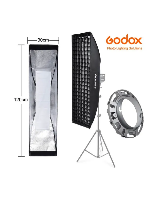 La ventana Godox Premium tamaño 30x120cm está diseñada para ser usada con flashes de estudio con montura Elinchrom (adaptador incluido).