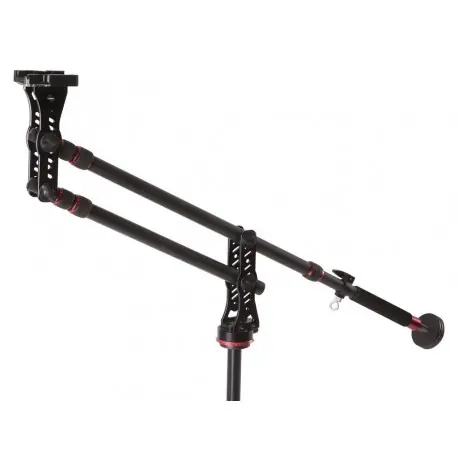 El Jirafa JB-1900 permite unidades de cámara en las tres dimensiones. Por ejemplo, la cámara puede volar sobre el objeto y moverse hacia el objeto desde la parte superior o aumentar la distancia. La cámara permanece en la posición horizontal exacta. El Jib JB-1900 se puede usar con cualquier trípode estable y es adecuado para todas las cámaras DSLM y DSLR, videocámaras y cámaras de película profesional hasta un peso total de 3,5 kg. 2 contrapesos ajustables de forma variable de 1 kg cada uno y un gancho permiten encontrar el equilibrio óptimo de la posición de la cámara. El Jib-1900 se empaqueta de forma compacta y, por lo tanto, está listo para su uso móvil.