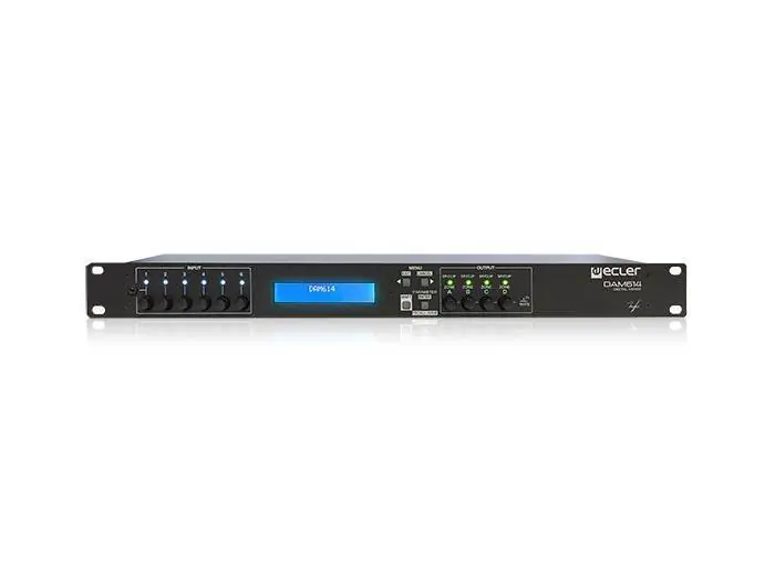 ECLER DAM614 es un mezclador digital de audio totalmente programable. Incluye 6 entradas de audio y 4 salidas de audio, control individual de selección y nivel de entradas y salidas en panel frontal, procesamiento DSP, interfaz RS-232 y 4 puertos de control remoto compatibles con paneles murales serie WPm (0-10VDC). Sus 4 salidas pueden trabajar en modo mono o enlazadas en estéreo, por parejas. Dos de sus entradas son de línea estéreo y las otras 4 son línea/micrófono (alimentación phantom disponible), siendo también posible configurarlas en modo mono o en parejas estéreo.