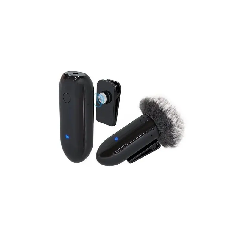 El kit incluye: 1x receptor, 1x transmisor, 1x cable de carga USB, 1x micrófono, 1x pantalla de viento, 1x clip magnético, cable de teléfono 3.5 mm, cable de cámara 3.5 mm