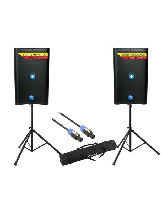 Equipo de sonido Maine combo 15 plug & play este equipo esta compuesto de un altavoz activo y uno pasivo de 15 pulgadas, una pareja de soportes de altavoz, y un cable de conexion speakon