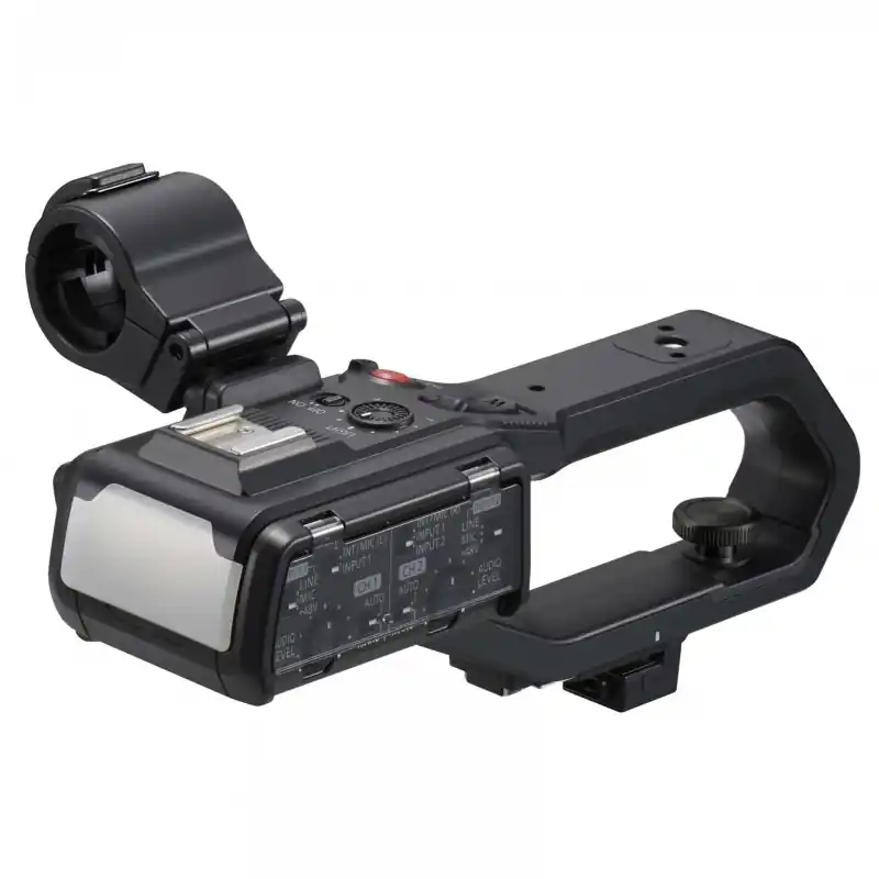 El VW-HU1 se conecta a la parte superior de la cámara usando su conector patentado y se asegura con un tornillo de mano. Las dos entradas de audio XLR de 3 pines tienen controles de volumen y funciones de micrófono/línea conmutables y alimentación fantasma de +48 V para que pueda agregar dos canales de audio a su grabación. Un soporte de micrófono en la parte superior puede acomodar un micrófono de cañón estándar para mayor comodidad.
