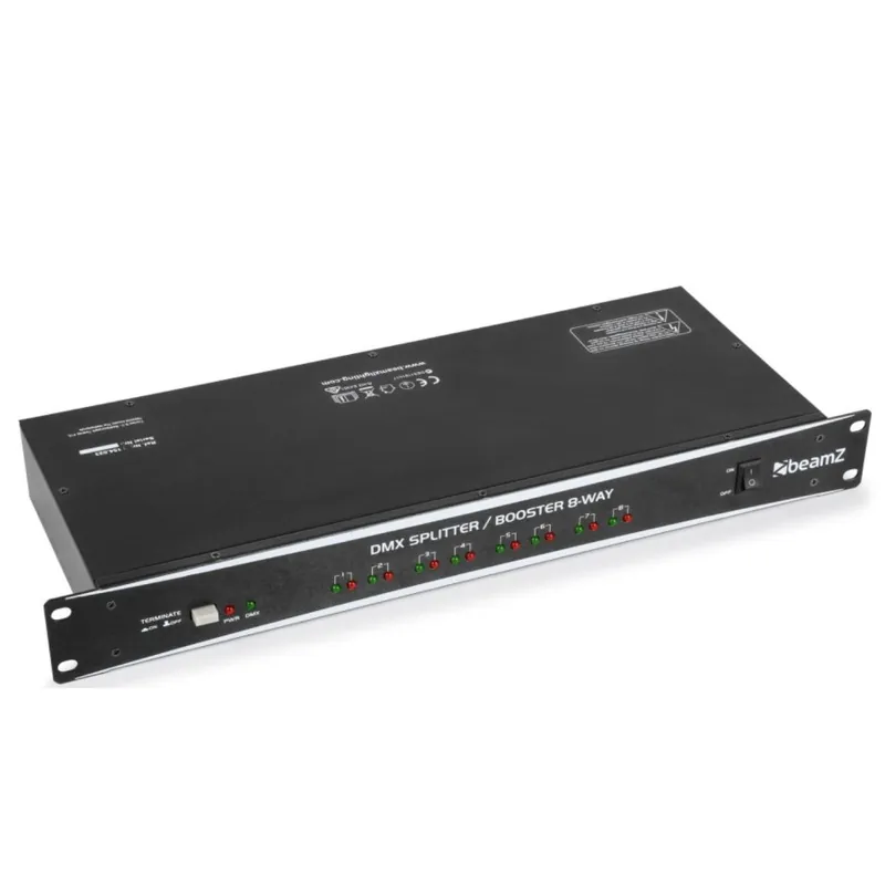 Este Splitter DMX fabricado por BEAMZ se puede enracar en una unidad de rack y dispone de distribuidor de 8 vías DMX con conectores XLR de 3 pines de entrada y salidas en JACK.