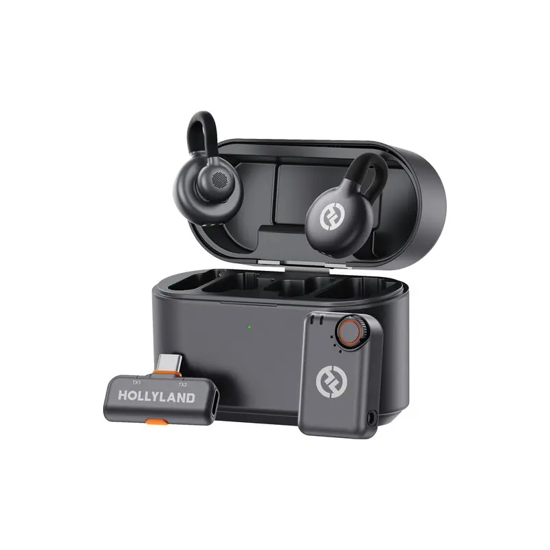 Grabe hasta dos personas en aplicaciones de periodismo móvil o creación de contenido con este sistema de micrófono inalámbrico LARK M2S DUO de Hollyland . El sistema incluye dos transmisores ultracompactos con micrófonos omnidireccionales integrados para una grabación discreta, un receptor enchufable USB-C para conexión directa con dispositivos móviles y un estuche de carga. Los transmisores cuentan con un diseño de clip de titanio para sujetarlos de forma segura a su talento y no tienen logotipos visibles para una apariencia discreta.