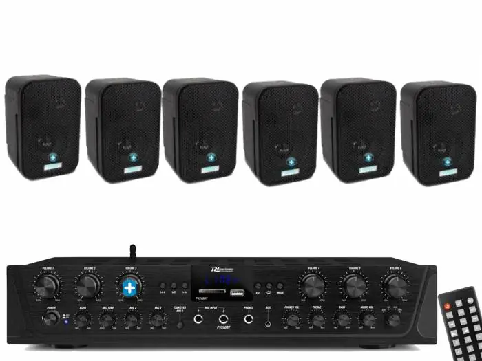 Equipo de sonido compuesto de amplificador de 6 zonas y 6 altavoces de 4 ohm. Pefercto para sonorizar en instalaciones tanto en interior como en pequeños exteriores o terrazas. Este equipo de Hilo musical dispone de con 4 zonas de control de volumen diferenciadas, te permite tener un control de volumen de cada altavoz. , un sonido con la misma musica o mensajes de voz, pero te permite tener 4 volumentes diferenciados, de una manera facil y sencilla desde el frontal del amplificador. Maximo control y con un montaje muy sencillo.