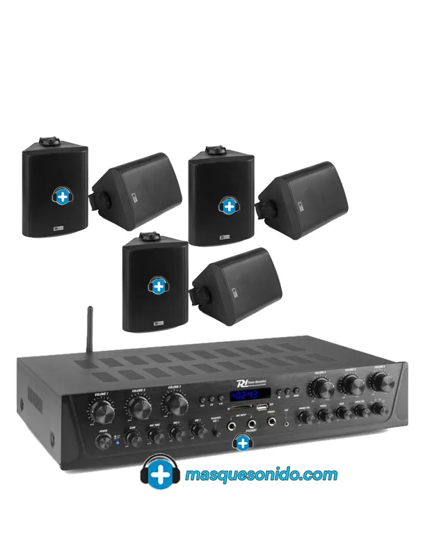 Equipo de sonido compuesto de amplificador de 6 zonas y 6 altavoces de 4 ohm. Pefercto para sonorizar en instalaciones tanto en interior como en pequeños exteriores o terrazas. Este equipo de Hilo musical dispone de con 6 zonas de control de volumen diferenciadas, te permite tener un control de volumen de cada altavoz. , un sonido con la misma musica o mensajes de voz, pero te permite tener 6 volumentes diferenciados, de una manera facil y sencilla desde el frontal del amplificador. Maximo control y con un montaje muy sencillo.