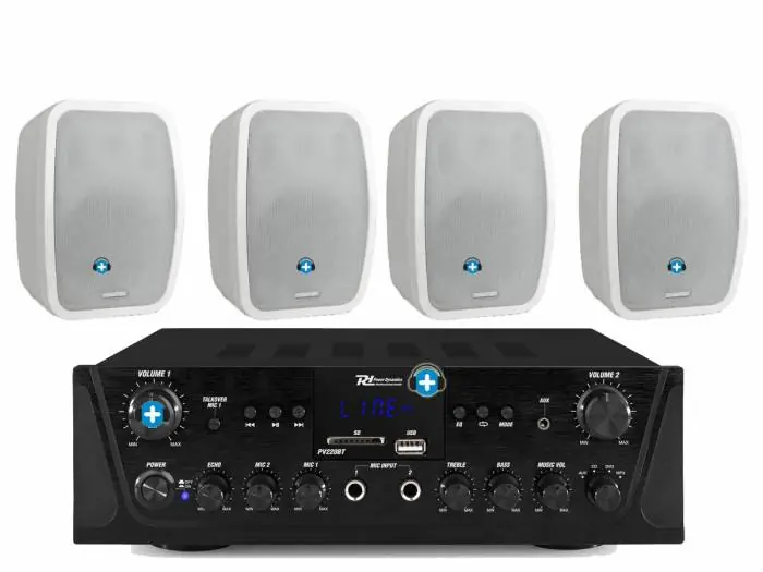 El equipo de sonido Tienda 401 Multimedia es un kit de hilo musical para tiendas, cafeterías o pequeños pub con 2 parejas de altavoces en color blanco Work NEO 5 y un amplificador Power Dynamnic con lector USB y SD, conexión Bluetooth y mando a distancia.