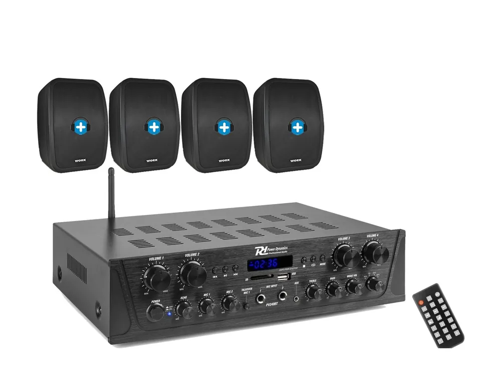 Equipo de sonido compuesto de amplificador de 4 zonas y 4 altavoces de 4 ohm. Perfecto para sonorizar en instalaciones tanto en interior como en pequeños exteriores o terrazas. Este equipo de Hilo musical dispone de con 4 zonas de control de volumen diferenciadas, te permite tener un control de volumen de cada altavoz. , un sonido con la misma musica o mensajes de voz, pero te permite tener 4 volumentes diferenciados, de una manera fácil y sencilla desde el frontal del amplificador. Maximo control y con un montaje muy sencillo.