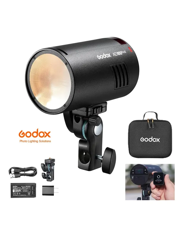 El Godox AD100Pro II es un flash portátil profesional que combina la potencia de un flash de estudio con la portabilidad de un speedlite avanzado.