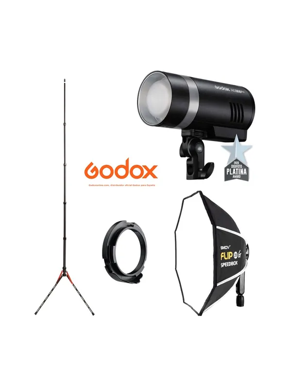 Con el potente flash AD300 Pro, la rápida y práctica Speedbox-Flip20G, el adaptador G estable y el trípode portátil Caruba,