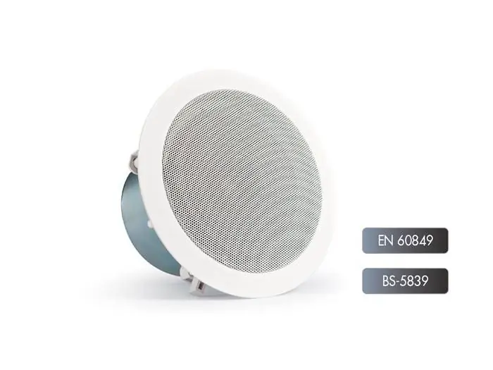 Altavoz de techo con transformador de línea 100 V y baja impedancia, rejilla redonda y caja antifuego.