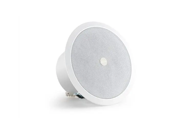 Altavoz de techo con transformador de línea 100 V, rejilla redonda y caja antifuego.