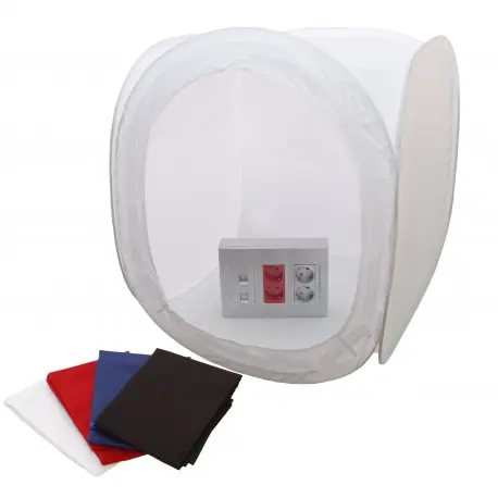 l Cube Estudio FOTIMA es un cubo translúcido en forma de tienda de campaña para una iluminación uniforme y suave de productos. Cubierta desmontable frontal con ranura para el objetivo de la cámara. Marco muy flexible, se monta y se pliega muy fácilmente. Incluye fondos de tela en 4 colores Blanco, Negro,