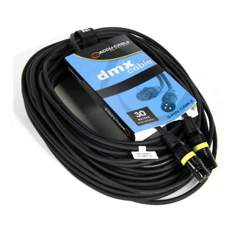 El ACCU-CABLE AC-DMX3/30 3 P. XLRM/3 P. XLRF 30M DMX es un cable de alta calidad que proporciona una conexión segura y estable para sistemas de control DMX. Con una longitud de 30 metros y conectores XLR de 3 pines, este cable es perfecto para garantizar un rendimiento óptimo en instalaciones de iluminación y control de efectos.