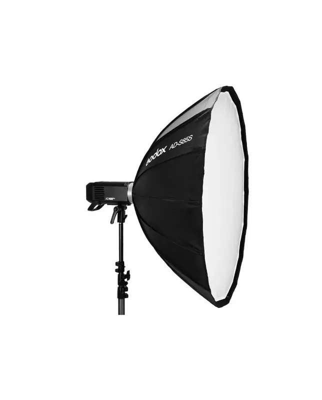 Esta Softbox Parabólica AD-S85W en blanco, de Godox, mide 85 cm y tiene un diseño profundo para emitir una luz suave con una caída pronunciada que simplifica el difuminado y la iluminación de los bordes. La rejilla de tela incluida frustra la luz derramada y ofrece el control direccional necesario para una iluminación selectiva.
